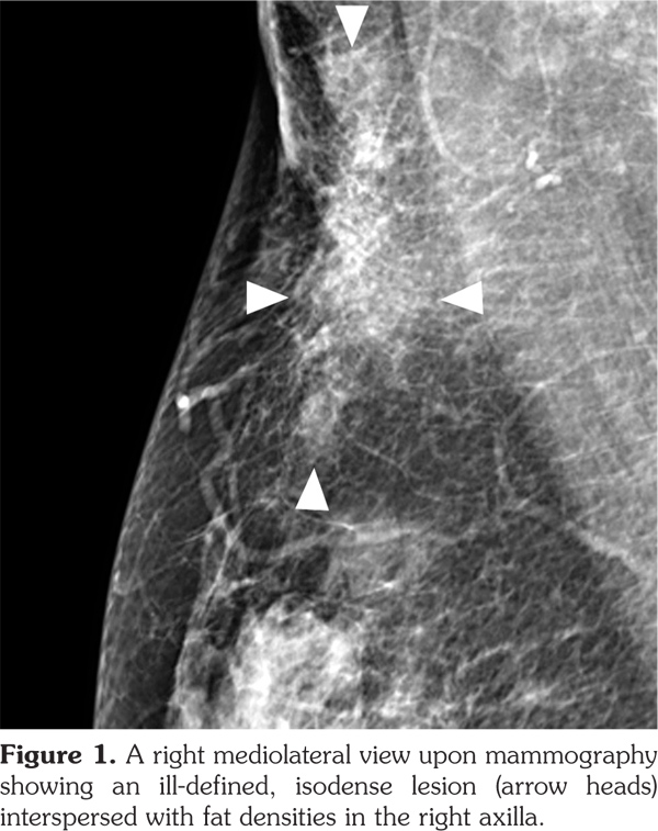 A 45-year-old woman was admitted to our hospital for the evaluation of a painless and palpable lump in her right axilla. The patient discovered the mass two weeks ago. The mass was poorly defined and felt soft upon palpation. The patient history had no trauma injection of exogenous substances or topical application of oily substances in the affected area.