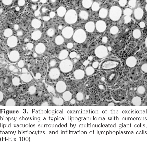 Histopathologically, lipogranuloma is characterized by multiple fat vacuoles surrounded by granulomatous tissue composed of multinucleated giant cells, epithelioid histiocytes, and fibrosis.(2,6) Regardless of the kind of exogenous material responsible for secondary lipogranuloma including paraffin, petrolatum, mineral oils, lanolin, and silicone, a similar histopathological appearance is produced after injection.(6)