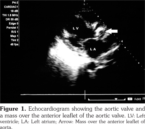 The patient had normocytic normochromic anemia with a hemoglobin level of 8 g/dL, white blood cell count of 14000/mm3 with 80% neutrophils, serum urea value of 80 mg/dL, and serum creatinine value of 2.5 mg/dL. Serum electrolytes and liver function test results were normal. Urinalysis examination revealed protein 3+, and 15-20 red blood cells per high power field. Twenty-four-hour urine protein was 1.2 grams. Abdominal ultrasound revealed enlarged kidneys with increased echotexture and altered corticomedullary differentiation. Thoracic X-ray demonstrated bilateral pulmonary infiltrates, while computed tomography revealed bilateral patchy opacities with thickening of the right horizontal fissure and bilateral alveolar infiltrates. Echocardiography also revealed a mass over the anterior aortic valve with mild aortic stenosis and moderate aortic regurgitation (Figure 1). Anti-neutrophilic cytoplasmic antibody (ANCA) serology showed a markedly increased level of anti-proteinase 3 (anti-PR3) (31 IU/ml, cut off ≤3.5 IU/ml), and anti-myeloperoxidase (anti-MPO) level of 2.1 IU/ml (cut off ≤9 IU/ml). Blood cultures were sterile. Antinuclear antibodies, human immunodeficiency virus, hepatits B surface antigen, hepatitis C virus serologies and sputum for acid-fast bacilli were negative. A preliminary diagnosis of GPA with acute nephritis and probable alveolar hemorrhage were made based on the possibility of concomitant infective endocarditis/involvement due to GPA. The patient was firstly treated with broad-spectrum antibiotics. However, after three days of no response to the antibiotic therapy, the patient was started on pulse methylprednisolone doses of one gram per day for five days along with pulse cyclophosphamide of 750 mg, and the antibiotics were also continued. The patient improved over a period of one week, and his hemoptysis stopped. His repeat urea was 60 mg/dL, and serum creatinine level was 1.5 mg/dL. The patient was discharged with prednisolone 60 mg per day and was asked to apply to the outpatient department for the next pulse of cyclophosphamide. However, the patient did not report back and was lost to follow-up.