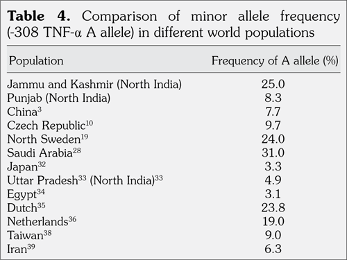 To the best of our knowledge, this is the first study conducted in the population of Punjab, and Jammu and Kashmir for the association of TNF-α -308 G>A polymorphism with RA. The frequency of TNF-α -308 minor allele (A allele) observed in the control population of the present study was compared with other world populations, and the data is presented in Table 4. The frequency in the control population of Punjab (cohort 1) was 8.3%, which was similar to Chinese (7.7%)(3) and Czech (9.7%),(10) and higher than Japanese (3.3%), Egyptian (3.1%) populations, and the North Indian (4.9%) population from Uttar Pradesh.(32-34) The frequency in cohort 2 comprising the Jammu and Kashmir population (25%) was nearly similar to that reported in European populations including North Swedish (24%),(19) Dutch (23.8%),(35) and Netherlands (19%)(36) but lower than Saudi Arabian (31.0%)(28) population. The frequency of A allele in Jammu and Kashmir was higher compared to the population of Punjab. When the frequency of A allele and AA genotype was compared in RA patients, the frequency was higher in Jammu and Kashmir population (18.8% allele and 3.8% genotype) than Punjab population (10.2% allele, 2.4% genotype). The higher frequency of A allele and AA genotype in Jammu and Kashmir population probably reflects the effects of geographical and cultural constraints resulting in higher endogamy. Therefore, the effect of inbreeding in Jammu and Kashmir population could have lead to an increased minor allele frequency in the population.(37)
