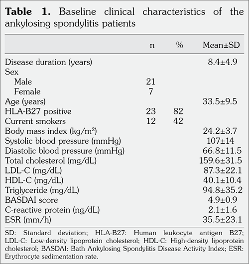 This study was conducted between September 2009 and 2012. Twenty-eight patients (21 males, 7 females; mean age 33.5±9.5 years; range 20 to 52 years) with AS were consecutively recruited. Assessments were performed at initial stage, 24th week (intermediate follow-up time point) and two years after the initiation of therapy. All patients fulfilled the modified New York diagnostic criteria of AS, and were scheduled for anti- TNF-a treatment according to the Assessment of SpondyloArthritis International Society (ASAS) guidelines.(14,15) Informed consents were obtained before enrolment, and approval for the study was granted by the local ethical committee of the university. We excluded patients with diabetes mellitus (fasting blood glucose >7 mmol/L) and those on anti-hypertensive medications or lipidlowering therapies. Patients with a history of CV diseases (stroke, heart failure, myocardial infarction or angina, and peripheral vascular disease) were also excluded. Adherence to the current therapy was closely followed by ensuring that all of the patients received the planned medication during the reported follow-up period. The use of NSAIDs was not restricted. At the 24th week of the evaluation, six patients (3 males and 3 females) declined to be involved for further analysis; therefore, these patients were not included in the two-year follow-up. The study was carried out in compliance with the principles of Helsinki Declaration. The study was approved by the Ethics Committees or Internal Review Boards of the participating institute.