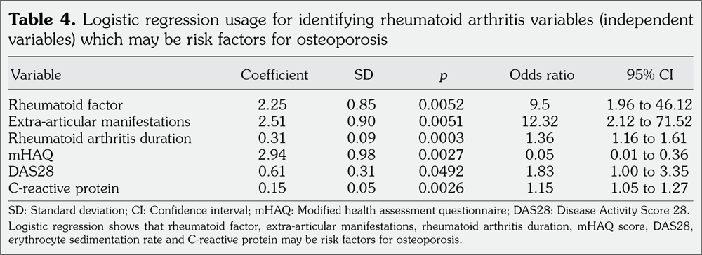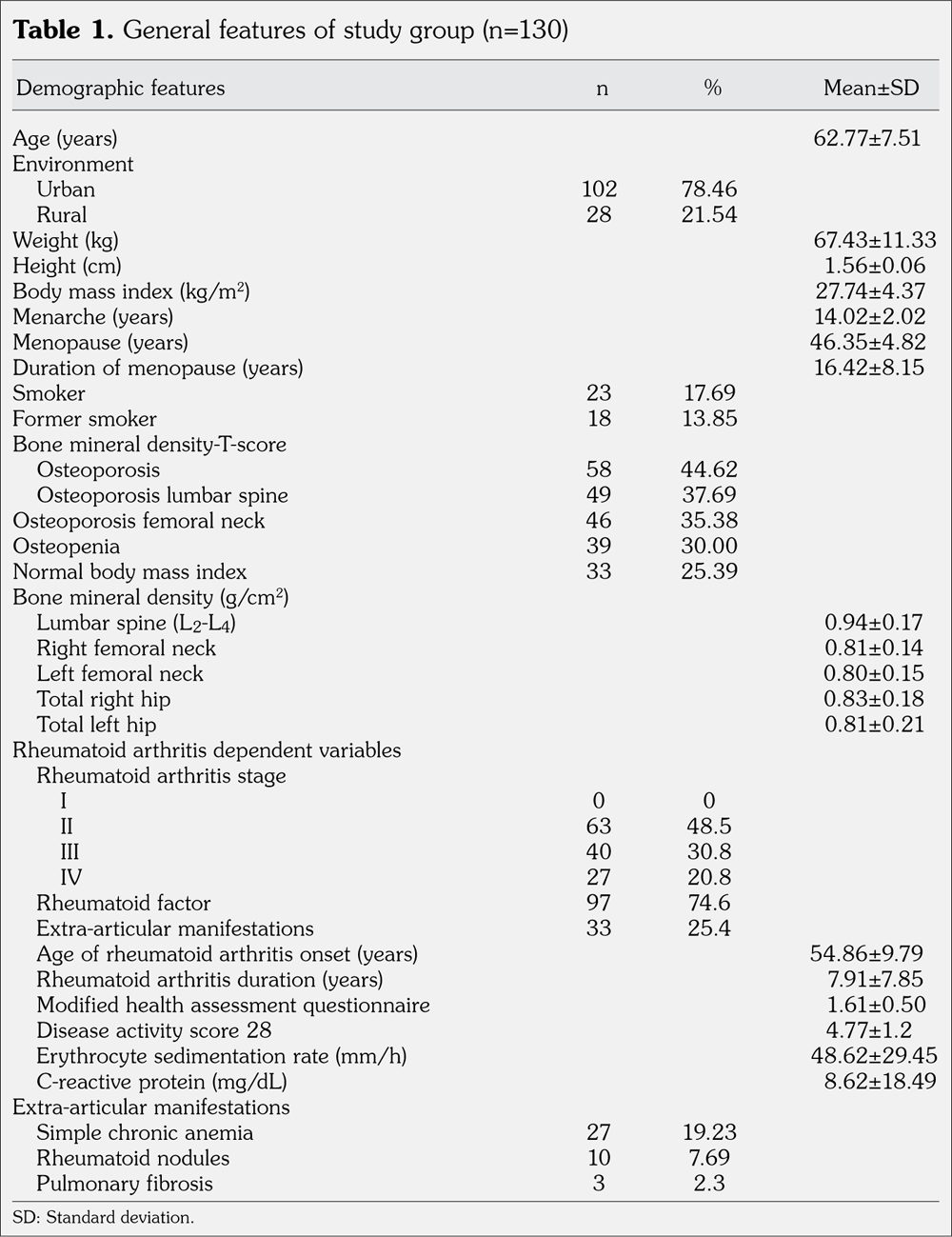 Patients and methods: The study included 130 females (mean age 62.77Å}7.51 years; range 57 to 69 years) who reached menopause, and were diagnosed with RA. Bone mineral density was measured at the lumbar spine level and femur (femur head, entire femur) through osteodensitometry with dual X-ray absorptiometry. Age, weight, height, body mass index, environment (urban, rural), age of the menarche and the onset of menopause, duration of menopause, smoker/non-smoker status, RA stage, RA onset age, duration of RA, extra-articular manifestations, the presence of rheumatoid factor, erythrocyte sedimentation rate, C reactive protein, disease activity score 28, and physical disability quantified by modified health assessment questionnaire were used for evaluating the RA activity.