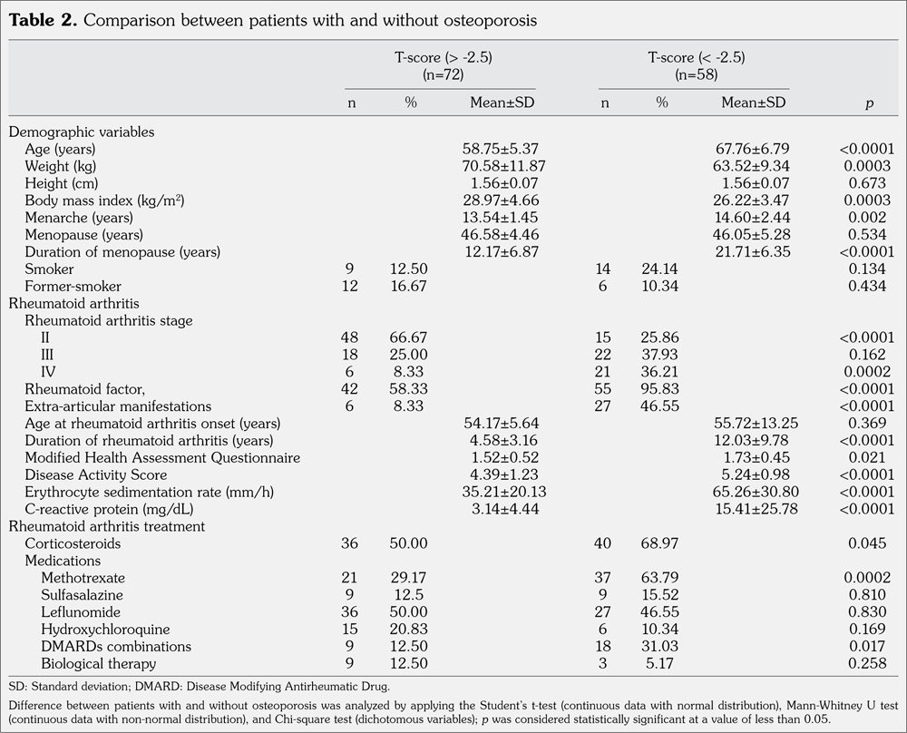 Rheumatoid arthritis (RA) is a disease characterized by a systemic chronic inflammation which mainly affects the joints through cytokines, chemokines and metalloproteinases. Osteoporosis (OP) is considered to be an extra-articular manifestation of RA,(1) with the prevalence of OP being higher in RA patients than in the general population.(2)