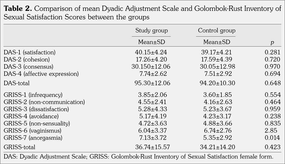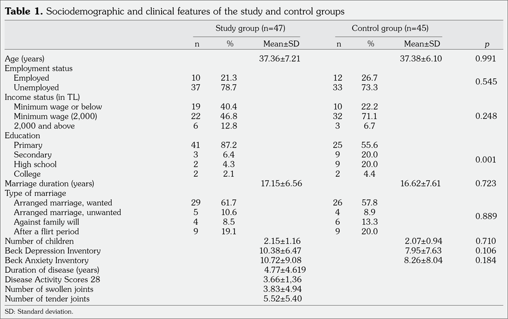 Patients and methods: The patient group consisted of 47 female patients with a diagnosis of RA between the ages of 18-55 (mean age 37.36±7.21 years), married and who have not entered menopause yet. Forty-five healthy women were included as a control group. Golombok Rust Inventory of Sexual Satisfaction (GRISS), Arizona Sexual Experiences Scale (ASEX), Dyadic Adjustment Scale, Beck Depression Scale, Beck Anxiety Scale, and Disease Activity Scores in 28 joints were evaluated.