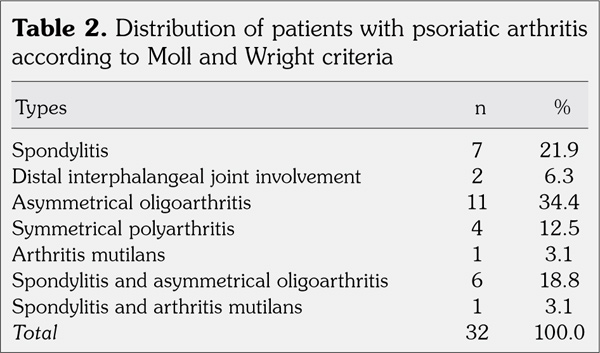Our classification of PsA according to Moll and Wright criteria revealed that the oligoarticular type was more common(2,16,17) whereas other studies demonstrated that polyarticular type was the most common,(15) or found similar prevalence for oligoarthritis and polyarthritis.(18)