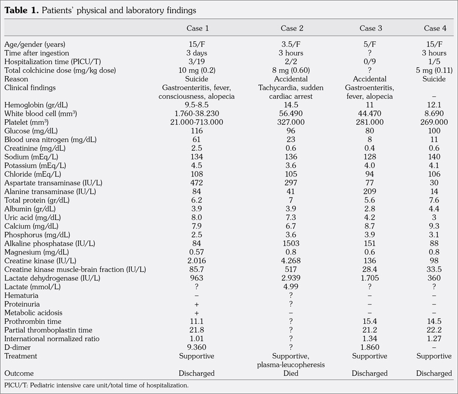 Colchicine is a natural alkaloid which is derived from the colchium autumnale plant. It is used in the treatment of familial Mediterranean fever, amyloidosis, gout, Behçet’s disease, and inflammatory bowel disease. In this article, we present four colchicine intoxication cases who were admitted to our clinic last year. While two patients ingested colchicine accidentally, other two took it for attempted suicide. First patient’s clinical signs were gastroenteritis, fever, and alopecia. This patient developed renal, hepatic dysfunction, and rebound leucocytosis. Patient was given support treatment and discharged. Second patient’s physical examination was normal except for tachycardia. Twenty hours after taking the medication, patient developed leucocytosis. The patient was performed plasmapheresis and leukapheresis. Thirty-nine hours after intake, patient developed sudden cardiac arrest and died. Third patient’s clinical signs were gastroenteritis, fever, and alopecia. Patient developed hepatic dysfunction and rebound leucocytosis. Support treatment was given and patient was discharged. Last patient had no clinical sign or laboratory finding and was discharged. Doctors and other healthcare employees should be alert for possible colchicine intoxication symptoms. Early detection of overdose symptoms is significant in terms of treatment success.