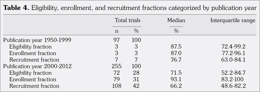 It can be argued that analyzing trials published only after 2000 may increase these proportions since description of the recruitment process was improving in 2000s.(16) Indeed, previous studies analyzed trials published after 2000,(8,14-18) whereas our study included all trials published after 1955. Our examination of KOA trials published after 2000 revealed that a majority of the trials actually reported the number of patients screened or eligible compared with those published before 2000 (Table 4). Nonetheless, the proportions of trials reporting three fractions were still low.
