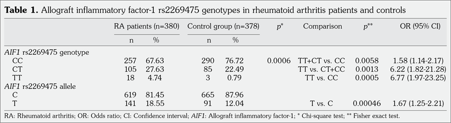Objectives: This study aims to examine whether the allograft inflammatory factor-1 (AIF1) gene rs2269475:C>T polymorphism is associated with rheumatoid arthritis (RA) susceptibility, and whether this polymorphism influences disease activity in patients with RA.