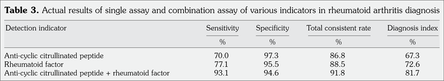 Since early diagnosis and treatment are crucial for a positive prognosis in RA, the sensitivity of the indicator used for detection is very important. In some domestic reports, the parallel combination mode was typically used to calculate the sensitivity of the combined assay. Thus, the combination of highly specific anti-CCP and highly sensitive RF assays is widely used. At present, the anti-CCP antibody assay has gradually become widely used in the clinic. In relevant domestic reports,(14,15) the combination of anti-CCP antibody and RF assays was superior to either single item assay. There was no difference due to sex, which is consistent with the report that anti- CCP antibodies can act as an early diagnostic indicator of RA. Therefore, the combined assay had a higher diagnostic value when combined with the RF assay. According to Table 3, the sensitivity of the combined assay is 87.1%, higher than that of anti-CCP or RF assays alone (70.0% or 77.1%, respectively), whereas the combined assay specificity is 94.6%, slightly lower than that of anti-CCP (97.3%) or RF (95.5%) alone. In addition, the total consistency rate (91.8%) and diagnosis index (81.7%) are higher for the combined assay than for either single item assay. Therefore, we suggest that the combined anti-CCP and RF assay is necessary in the clinic, and has applicable value in early diagnosis, early treatment, and prevention of RA. In summary, the combination of anti-CCP and RF assays greatly increases RA diagnosis sensitivity and makes up for the shortcomings of single item assays, providing an experimental method for early diagnosis and treatment in the clinic. Nevertheless, further studies are required to investigate the value of different combinations of the anti-CCP antibody assay and assays for various subtypes of RF in RA diagnosis.