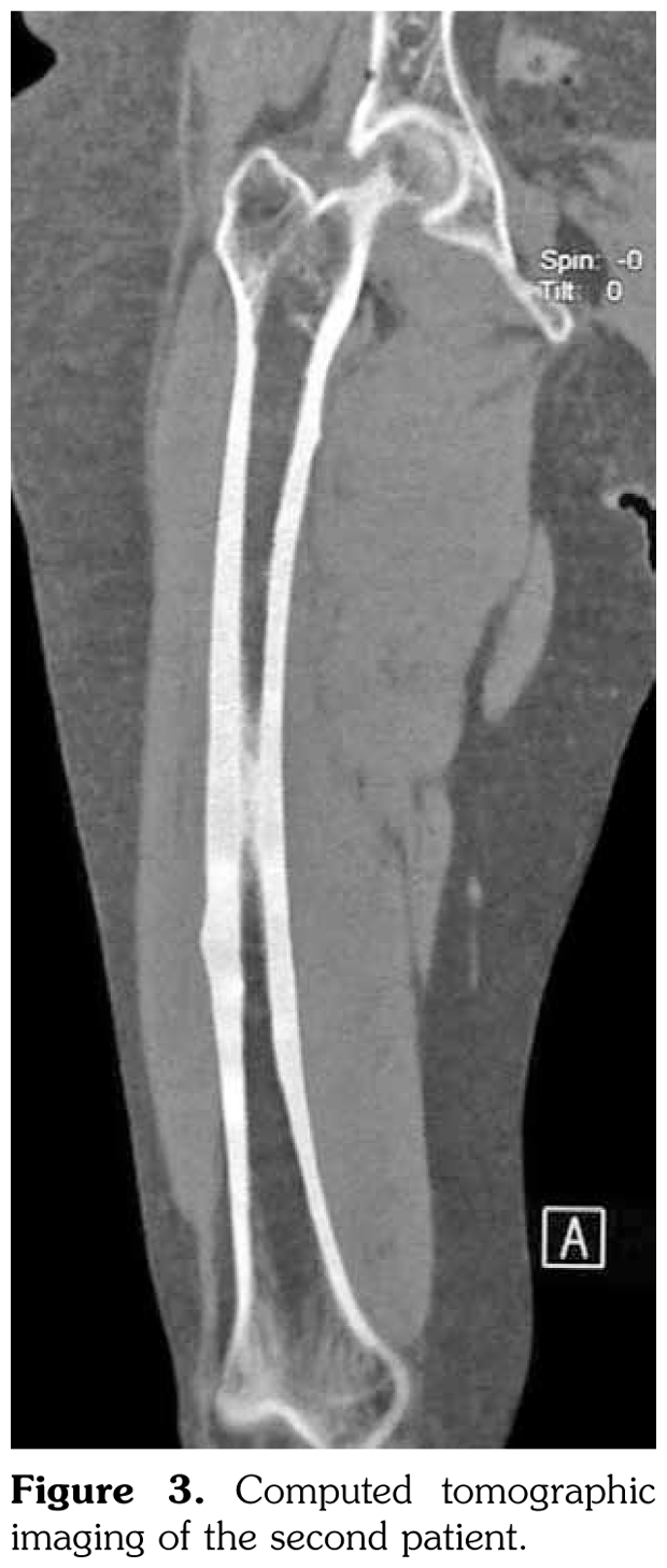 Case 2– A 61-year-old female patient presented with anterior thigh pain and difficulty in walking. Pain severity was 7 over 10 point according to visual analog scale. She had been treated with alendronate 70 mg per week with calcium plus vitamin D for two years. Plain radiographs of femur were taken upon clinical presentation. Cortical stress reaction was detected in both femoral shafts on plain radiographs (Figure 2). Computed tomographic imaging was performed to rule out fracture (Figure 3). Bone scintigraphy showed increased uptake in distal (1)/3 ends of femoral shafts (Figure 4). Serum calcium value was normal and urinary deoxypiridinoline level was mildly increased (46 nM/mMCre).