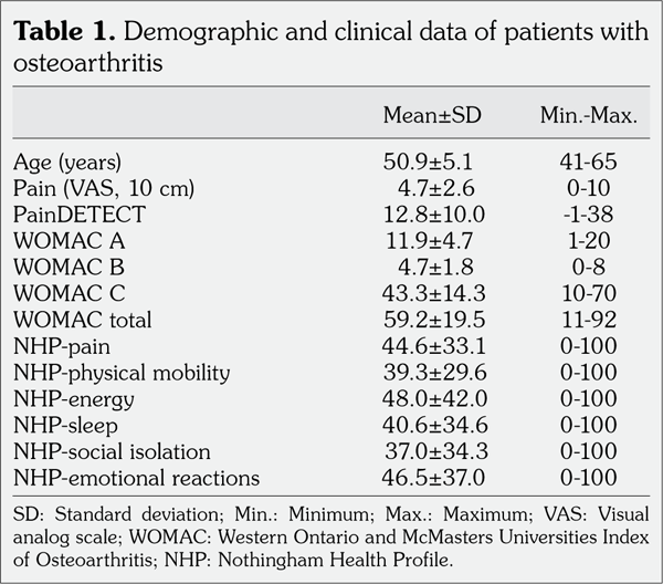 In OA patients, mean score was 11.86±4.66 for WOMAC A, 4.72±1.81 for WOMAC B, 43.28±14.29 for WOMAC C, and 59.24±19.48 for WOMAC total. The mean QoL scores of the patients were 44.56±33.07, 39.25±29.62, 48.00±41.99, 40.60±34.75, 37.00±34.27, and 46.5±37.02 in the pain, physical mobility, energy, sleep, social isolation and emotional reactions subgroups of NHP, respectively. Demographic and clinical data of the patients are summarized in Table 1.