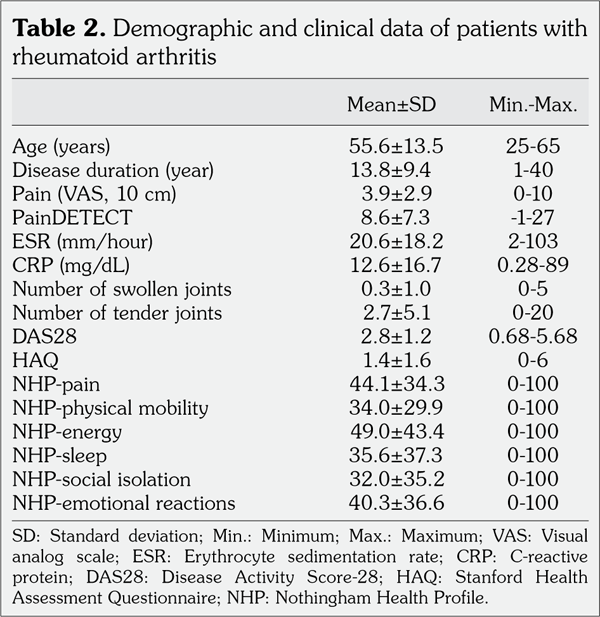 In RA patients, mean score was 2.81±1.16 for Disease Activity Score-28, and 1.44±1.55 for Health Assessment Questionnaire. The mean QoL scores of the patients were 44.14±34.34, 34.00±29.88, 49.00±43.44, 35.6±37.32, 32.00±35.23, and 40.25±36.62 in the pain, physical mobility, energy, sleep, social isolation and emotional reactions subgroups of NHP, respectively. Demographic data and clinical characteristics of the patients are summarized in Table 2.