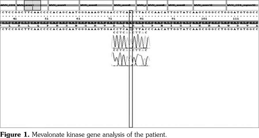 The patient had IgD (serum): <15 IU/mL (0-100 IU/mL) and IgA (serum): 139 mg/dL (45-380 mg/dL). Genetic analysis showed homozygotic S53N mutation on MVK gene 3rd exon, and the HIDS diagnosis was made. Our laboratory conditions were incapable of evaluating MVK enzyme activity, and mevalonic acid levels were not measured in the urine because the patient was in a non-attack period.