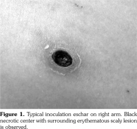 Adult-onset Still’s disease (AOSD) is a rare autoinflammatory disorder with typical features of spiking fever, evanescent rash, and arthritis/ arthralgia. Pathogenesis of AOSD is not well known, and it is hypothesized that environmental triggers may initiate disease in individuals with genetic susceptibility. Anecdotal reports have indicated close temporal relationship between AOSD and various infections, which may suggest infectious triggers for developing AOSD, but rickettsial diseases were rarely reported.(1-5) A 51-year-old female patient presented with fever for one month. Three weeks ago, she was diagnosed as scrub typhus with fever, severe myalgia, arthralgia, rash, and eschar in the right arm at another hospital (Figure 1). She was a farmer living in Chungcheong province, a rural area of Korea. After introduction of oral doxycycline, patient felt better subjectively, but fever was relapsed. She was treated with empirical intravenous antibiotics for fever of unknown origin for 10 days. She began to complain of pain in the wrists, knees, and ankles and was transferred to our hospital. Spiking fever of 38.3° Celcius once or twice a day was noted. There was maculopapular rash on upper chest and both lower legs, which was minimally itchy and not evanescent. Painful joints were tender but not swollen. Laboratory findings were as follows; white blood cell: 13,700/μL, hemoglobin: 9.9 g/dL, erythrocyte sedimentation rate: 83 mm/hr, C-reactive protein: 10.3 mg/dL, aspartate aminotransferase: 124 IU/L, alanine aminotransferase: 131 IU/L, ferritin>2000 ng/mL (4.63-204.0), rheumatoid factor 6.9 IU/mL, antinuclear antibody 1:80. Antibodies for viral and rickettsial diseases were negative. Abdominal computed tomography revealed several enlarged lymph nodes around common hepatic artery and hepatoduodenal ligament, and other results for evaluation of fever of unknown origin were negative. Patient had severe sore throat during admission and we diagnosed her as having AOSD by Yamaguchi criteria.