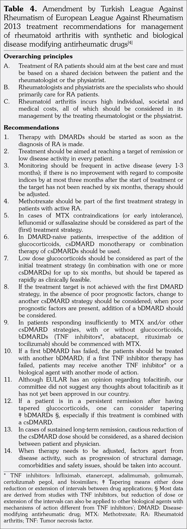 Objectives: This study aims to report Turkish League Against Rheumatism’s assessment on the compliance of European League Against Rheumatism 2013 treatment recommendations for rheumatoid arthritis with practices in Turkish rheumatology clinics and adaptations for Turkey.