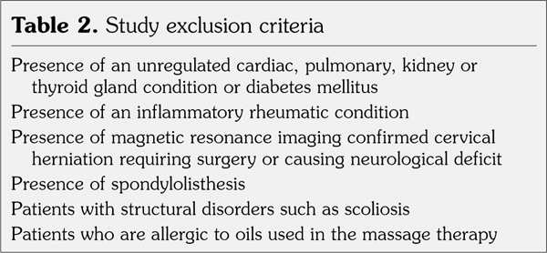 The study population was chosen among patients with chronic neck pain who attended the Outpatient Clinic of Department of Physical Medicine and Rehabilitation of Medical Faculty of Afyon Kocatepe University between August 2007 and July 2008. All patients’ informed signed consent was obtained. The study was approved by our Institutional Research Ethics Committee. A total of 70 patients were enrolled in the study. Patients were randomized either to spa therapy group (7 males, 28 females; mean age 43.08±9.76 years; range 26 to 66 years) or exercise therapy group (5 males, 30 females; 46.45±9.65 years; range 27 to 65 years) by using the table of random numbers. Study inclusion criteria and exclusion criteria are shown in Table 1 and Table 2, respectively.