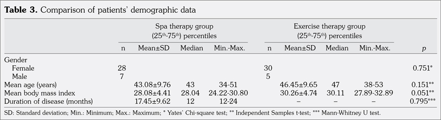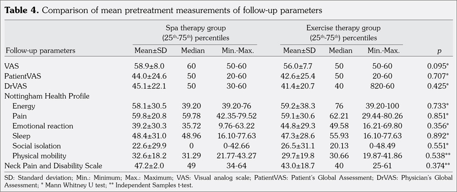 Patients and methods: Seventy patients who applied to our outpatient clinic with chronic mechanical neck pain lasting for 12 weeks were included in the study. Patients were randomized either to spa therapy group (7 males, 28 females; mean age 43.08±9.76 years; range 26 to 66 years) or to exercise therapy group (5 males, 30 females; 46.45±9.65 years; range 27 to 65 years). Spa therapy group received a total of 15 sessions of thermal water, mud therapy, and classic massage to cervical region. Both exercise and spa therapy groups performed home exercise program once a day for 15 days. All the patients were evaluated before treatment, at the first week and at the third month after treatment, a total of three times. In each control; visual analog scale, global assessment of the patient (Patient’s Global Assessment and Physician’s Global Assessment), Neck Pain Disability Scale, and Nottingham Health Profile were assessed.