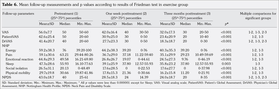 Tables 5 and 6 show the mean follow-up measurements and p values according to the results of Friedman test in the spa therapy and exercise therapy groups, respectively.