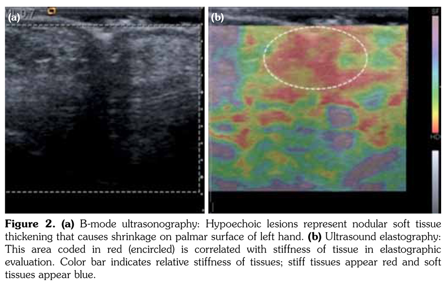 Dupuytren’s contracture is usually diagnosed clinically. Magnetic resonance imaging or ultrasound may be useful for the differential diagnosis including tenosynovitis, trigger finger, ganglion cyst, soft tissue mass or for imaging of vascular complications.(9) Main findings are fibrous nodules and cord-like thickening in palmar fascia. The normal superficial palmar fascia appears as a thin echogenic line overlying the flexor tendons. At ultrasonographic evaluation, an elongated hypoechoic thickened plaque typically continuing with one or more of the flexor tendons and deep surface of the dermis is the pathognomonic sign of the disease. Early nodules are hypoechoic and typically hypervascular in Doppler imaging whereas older nodules are hyperechoic and non- hypervascular due to fibrosis and scar tissue.(9) Compression sonoelastography which is a newly developed technique as an adjunct to ultrasonographic examination can be used in several musculoskeletal disorders to evaluate the elasticity of muscle structures, tendons, ligaments or soft tissues.(10) However, the clinical utility still remains under investigation. Elasticity is represented by color coding where areas of stiff tissue appear red and soft tissues appear blue.