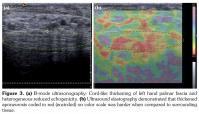 Active range of motion was measured with a finger goniometer which provided the following degrees of extension/flexion. Left hand: thumb metacarpophalangeal (MCP) joint -10/40, interphalangeal joint (IPJ) 0/40 and little digit MCP joint 0/80, proximal interphalangeal (PIP) joint 0/80. Right hand: thumb MCP joint 0/80, IPJ 0/80 and little digit MCP joint -20/40, PIP joint 0/40 (a negative value indicating lack of extension at MCP, PIP, and IPJ joints). The Hueston tabletop test was bilaterally positive (if the hand cannot be placed completely flat on the table with the palmar surface, the test is considered positive) and patient was diagnosed with DC. Patient’s medical history included high blood pressure, type 2 diabetes mellitus, and coronary artery disease. He had a five pack-year smoking history. Hematological examination and blood biochemistry results were normal. Ultrasonography and color Doppler imaging revealed thickening of both tendon sheaths and superficial palmar fascia with high vascularity and heterogeneity. There was no fluid in the tendon sheaths, which is a sign of tenosynovitis. The soft tissue thickening was also more superficial to the tendons located in the palmar fascia and deep surface of the dermis. The increased vascularity was interpreted as representing early signs of nodules and fibrosis which appear during the course of the disease. Nodular soft tissue thickening and thickened aponeurosis coded red on the color scale were harder when compared to the surrounding tissue, which supports fibrosis revealed in sonoelastographic examination (Figure 2, 3). We consulted plastic surgery but surgery was deemed to be appropriate for DC (thumb and little digit) after rehabilitation for post-traumatic ring finger. He was treated for bilateral hands with physical treatment program including contrast bath, ultrasound therapy, palmar massage, range of motion and stretching exercises for 15 days. Patient’s complaints decreased significantly. Also, improved hand functionality and increased range of motion were detected after treatment with the following degrees of extension/flexion. Left hand: thumb MCP joint 50, IPJ 20, little digit PIP joint 10. Right hand: little digit MCP joint 20, PIP joint 20.