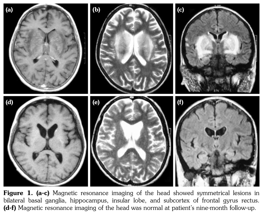 A 17-year-old girl was admitted to our hospital after one month of fever, hand erythema, and arthralgia. There were no significant findings in her personal or family history. Results from blood test showed leucopenia (white blood cell 2.7*109/L); positive antinuclear antibody (1:1000), anti-double stranded (ds) DNA, anti-Sjögren syndrome A antigen, anti-Sjögren syndrome B antigen, and anti-ribosome P protein; negative antiphospholipid antibody, anti-beta2GP1 antibody, and anti-neutrophil cytoplasmic antibodies (low complement 3 (0.31 g/L) and high erythrocyte sedimentation rate (89 mm/h). Urine test showed no hematuria or proteinuria. According to the 1982 revised criteria for the classification of SLE, she was diagnosed with SLE. The Systemic Lupus Erythematosus Disease Activity Index score was 16. She was administered with intravenous methylprednisolone (80 mg/day, her weight was 50 kg) for three consecutive days, followed by intravenous methylprednisolone (40 mg/day) and oral hydroxychloroquine (200 mg/day). Six days later, her temperature returned to normal, erythema almost disappeared, and arthralgia was significantly relieved. However, during this one-week period, she developed a progressive slowdown of motor response, movement, thinking, speech, and reaction to stimuli. She did not complain of any limb weakness or numbness, giddiness, diplopia, tinnitus, urinary or bowel dysfunction. Neurological examinations showed that she was fully oriented with no evidence of cognitive dysfunction, aphasia, paresthesia, meningism, lateralizing neurological deficits, or cranial nerve palsies. With disease progression, she developed obvious expressionless face, bradykinesia, marked rigidity, and hypermyotonia in her extremities. She also had a festinating gait with only slight arm swing, and her gaits turned and started in hesitation but without rest or action tremor.