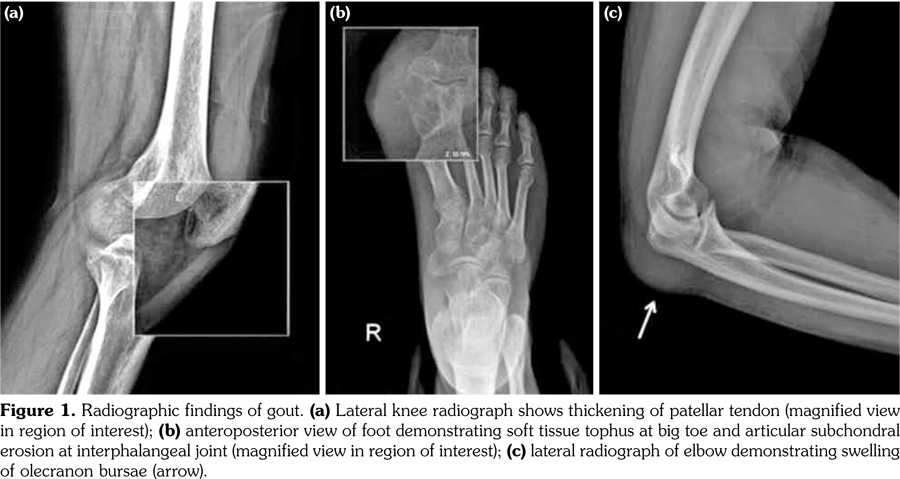 The gold standard for diagnosis of gout is presence of monosodium urate crystals in tophi or aspirated fluid.(1) Accurate classification of gout without crystal documentation is needed where synovial fluid aspiration cannot be performed. These issues led the international collaborative working group -American College of Rheumatology/European League Against Rheumatism- to develop new classification criteria.(6) The entry criterion requires one episode of joint/ bursa swelling, pain, and tenderness. Presence of monosodium urate crystals is sufficient for diagnosis. The domains of this classification include clinical, laboratory, and imaging criteria like pattern of joint/bursa involvement, serum urate levels, radiographic gout related erosions, urate on dual-energy computed tomography (DECT), or double contour sign on ultrasound. Patient refused aspiration biopsy and DECT for the patellar lesion owing to his previous experiences and met the American College of Rheumatology/European League Against Rheumatism gout classification criteria scoring 17/23.