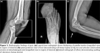 erosive changes, and swelling of olecranon bursae were seen (Figure 1). Magnetic resonance imaging showed fusiform mass-like thickening of the proximal patellar tendon, measuring 30x16 mm, with intermediate signal on T1 weighted and T2 weighted images. Edema of the tendon at insertion and patellar cortical irregularities not seen on radiograms were demonstrated (Figure 2).