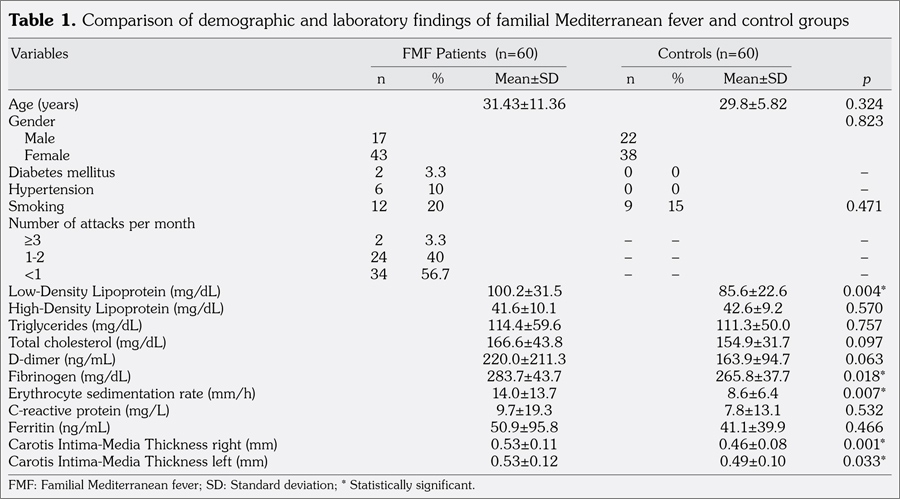 There were no significant differences between the FMF and control groups in terms of mean age (p=0.324) and sex (p=0.823). Rates for smoking were 20% and 15% in the FMF and control groups, respectively and the difference between two groups was not statistically significant (p=0.471). Number of attacks per month was ≥3 for two patients (3.3%), 1 for 24 patients (40.0%), and <1 for remaining 34 patients (56.7%). Demographic characteristics of FMF patients and controls are shown in Table 1.