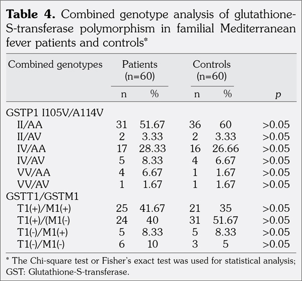 Subjects in the FMF and control groups were evaluated in terms of the GSTT1, GSTM1 and GSTP1 I105V, and A114V gene polymorphisms. In the FMF and control groups, GSTT1 null allele frequencies were 18.3% (n=11) and 13.3% (n=8), respectively. GSTM1 null allele frequencies in the patients and controls were detected as 50% (n=30) and 56.7% (n=34), respectively. The difference between two groups was not statistically significant in terms of GSTT1 and GSTM1 gene polymorphisms (p>0.05). GSTP1 Ile105Val polymorphism frequencies were 55% (n=33), 36.7% (n=22), and 8.3% (n=5) for Ile/Ile wild type, Ile/Val heterozygous, and Val/Val mutant homozygous in FMF patients, respectively. Frequencies of Ile/Ile, Ile/Val, and Val/Val genotypes were 63.3% (n=38), 33.3% (n=20), and 3.3% (n=2) in controls, respectively. No homozygous mutant genotype was detected for Ala114Val polymorphism. Ala/Val heterozygous genotype was detected in eight of FMF patients and seven of control subjects. Distribution of allele frequencies of two GSTP1 polymorphisms was also not statistically significant (Table 2).