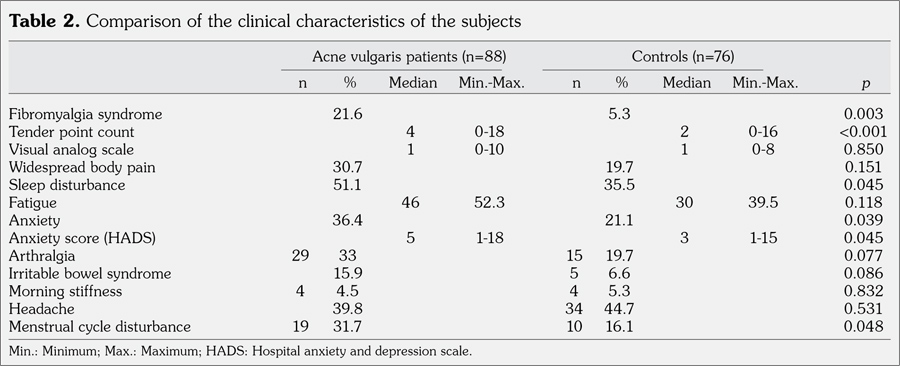 Results: Fibromyalgia-associated pain, sleep disturbance, anxiety, and menstrual cycle disturbance were significantly more frequent in patients with acne vulgaris than controls. Also, the severity of anxiety and the number of tender points were significantly higher in the acne vulgaris patients than controls.