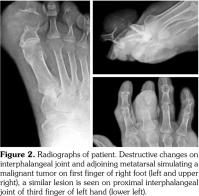 Radiography showed destruction on the IPJ and adjoining metatarsal simulating a malignancy on the first finger of right foot. A similar lesion was noticed on the proximal IPJ of the third finger of the left hand (Figure 2). Besides, soft tissue swellings, periarticular erosions, and osteophytes were seen. On sonography, a few echogenic foci compatible with nephrolithiasis were detected in the right kidney.