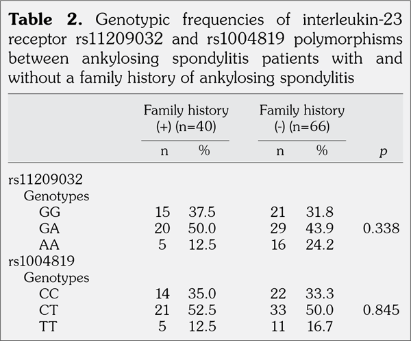 Sixty-nine AS patients (65.1%) were found positive and 37 (34.9%) were found negative in terms of HLA-B27 alleles. Distribution of rs11209032 genotype frequencies in AS group were 31.1% for GG, 50.9% for GA, and 17.9% for AA; while in control group, it was 34.1% for GG, 53.7% for GA, and 12.2% for AA. Distribution of rs1004819 genotype frequencies in AS group were 30.2% for CC, 52.8% for CT, and 17.0% for TT; while in control group, it was 42.7% for CC, 46.3% for CT, and 11.0% for TT. Of the patients with AS, 31.9% had a family history of AS, while 68.1% had no family history of AS. In patients with a family history of AS, the HLA-B27 positivity increased to 78.3%; while in AS patients with a negative family history of AS, the frequency of HLA-B27 positivity was 61.2%. However, the difference did not reach a statistically significant value (p > 0.05).