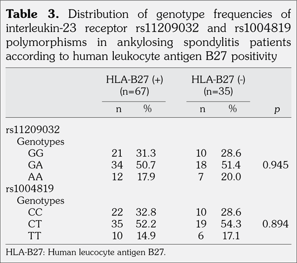 Patients and methods: The study sample comprised 106 AS patients (89 males, 18 females; mean age 38.9±10 years; range 19 to 65 years) and 82 healthy controls (70 males, 12 females; mean age 32.15±7.07 years; range 19 to 51 years). Distribution of HLA-B27 alleles (+)/(-) in AS patients were observed by reverse hybridization technique. Genotyping of IL-23R rs11209032 and rs1004819 polymorphisms of AS patients and healthy controls were performed by real time polymerase chain reaction.