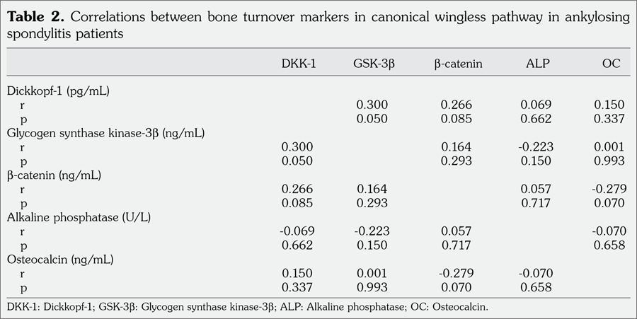 Results: No significant difference was observed between AS patients and healthy controls for the levels of glycogen synthase kinase-3β, β-catenin, alkaline phosphatase, and osteocalcin, respectively (p>0.05). The level of Dickkopf-1 was significantly higher in AS patients (1914.5±407.8 pg/mL) than in healthy controls (1729.1±352.9 pg/mL) (p<0.05). There was no correlation between high Dickkopf-1 level and any of the clinical parameters contributing to inflammation or bone formation. However, the correlation between osteocalcin and disease duration was significant in AS patients (r=0.323, p=0.034).
