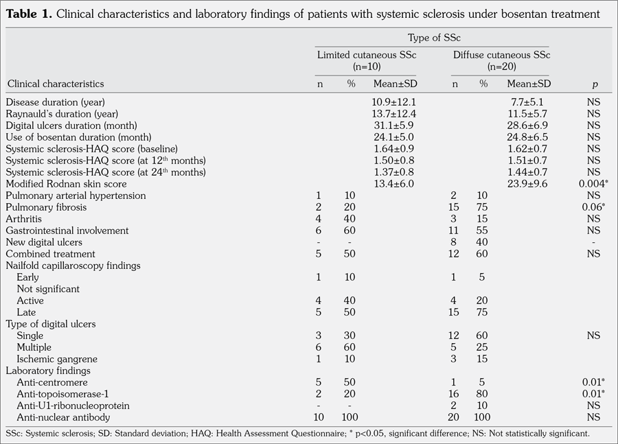Results: Mean disease duration was 8.8±8.0 years and mean duration of digital ulcers was 29.4±6.6 months. Under the bosentan treatment, eight patients (26.7%) developed new digital ulcers; all of these patients had diffuse cutaneous SSc. Health Assessment Questionnaire scores improved after 12 months and 24 months of treatment (p<0.001). Three patients (10%) developed pulmonary arterial hypertension under bosentan treatment [two patients (6.6%) had SSc-associated pulmonary arterial hypertension and one patient (3.3%) had interstitial fibrosis-associated pulmonary arterial hypertension]. The anti-centromere antibody positive patients were predominantly classified as limited cutaneous SSc. Of the patients positive for anti-topoisomerase-1 antibodies, a high proportion was classified as diffuse cutaneous SSc. Pulmonary fibrosis was most frequent in the anti-topoisomerase-1 antibody subset. New digital ulcers developed mainly in the anti-topoisomerase-1 antibody positive patients.