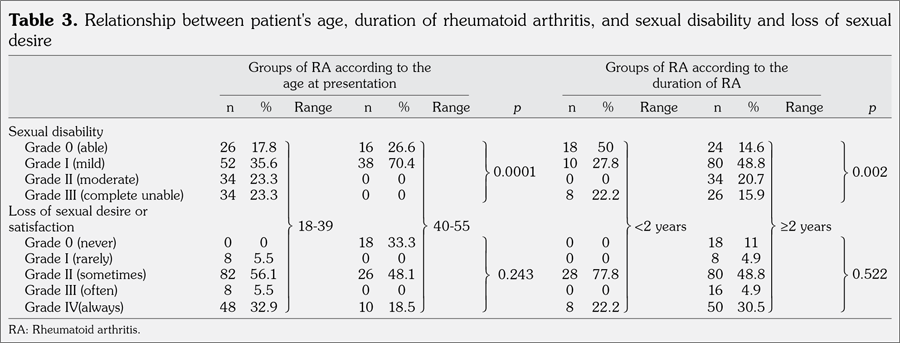Results: Majority of the patients had grade II physical disability (62%), moderate pain (55%), depression (46%), and anxiety (77%). Sexual disability and loss of sexual desire and satisfaction were reported in 4% to 77.8% of patients which varied with age, duration of RA, degree of physical disability, and psychiatric comorbidities. Multiple regression analysis showed that scores of sexual disability and loss of sexual desire and satisfaction were significantly associated with scores of Health Assessment Questionnaire Disability Index (β=0.347; p=0.018; β=0.501; p=0.001) and depression (β=0.304; p=0.043; β=0.550; p=0.001).