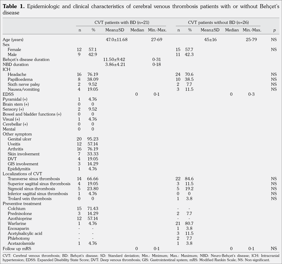 Patients and methods: Files of 47 patients admitted to our outpatient clinic for CVT between January 2007 and November 2014 were retrospectively reviewed. Patients were divided into two groups; group 1 included 21 CVT patients with BD (9 males, 12 females; mean age 47±12 years; range 27 to 69 years) and group 2 included 26 CVT patients without BD (11 males, 15 females; mean age 45±16 years; range 25 to 79 years). We collected data for diagnosis for BD and CVT, duration of all medications, functional system involvement, baseline Expanded Disability Status Scale scores, modified Rankin Scale scores at follow-up, and localizations of lesions in brain magnetic resonance imaging and magnetic resonance venography.