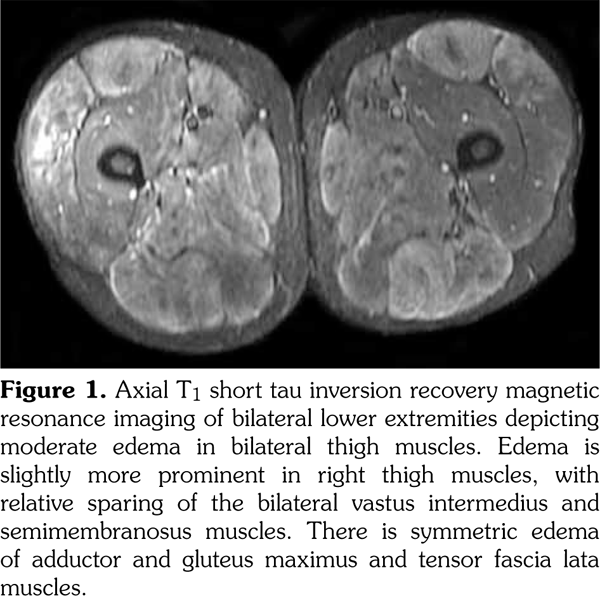 The patient had positive antinuclear antibody, with titer 1:1280 in a speckled immunofluorescence pattern and positive Sjögren’s syndrome antibody. The erythrocyte sedimentation rate was mildly elevated at 35 mm/hour and anti Jo-1 antibody was negative. These findings, along with the physical exam findings of lacrimal and parotid glands enlargement, were consistent with the Sjögren’s syndrome. The magnetic resonance imaging of bilateral thighs showed symmetric muscle edema of the thigh muscles (Figure 1). There was also moderate symmetric edema of the tensor fascia lata and gluteus maximus muscles. Given the symmetric muscle involvement and positive antinuclear antibody markers, rhabdomyolysis was deemed to be related to an inflammatory myopathy associated with Sjögren’s syndrome.