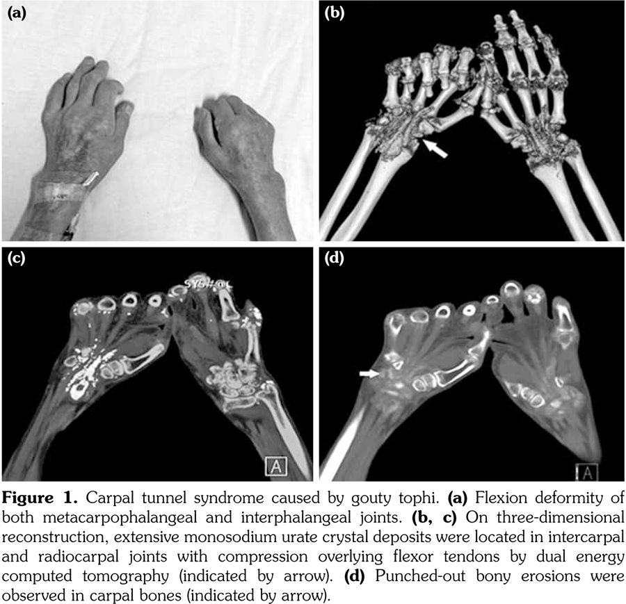 Although not rare, carpal tunnel syndrome (CTS) caused by gouty tophi is still uncommon according to the literature,(3) and its presence indicates the severity of untreated gouty tophi.(4,5) In the past, it was difficult to diagnose gouty tophi induced CTS unless surgery or biopsy was performed. However, thanks to the improvements in recent years in imaging techniques such as dual energy computed tomography (DECT) and ultrasound, it is now easier to diagnose gouty tophi induced CTS. In this article, we report a chronic gout patient with serious CTS secondary to monosodium urate crystal deposit diagnosed by DECT.