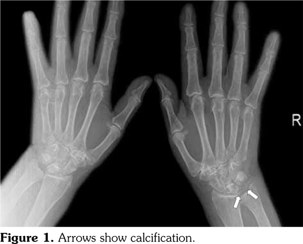 1.3 mg/dL (normal >1.8 mg/dL). On wrist X-ray, there were cystic lesions on carpal and metacarpal bones, and calcification at triangular cartilage localization (Figure 1). Musculoskeletal ultrasonography (USG) of the wrist joint was performed. Effusion was detected at radiocarpal joint on gray scale USG and active synovitis were detected on power Doppler USG. CPDD of the wrist was diagnosed. Prednisolone 5 mg/day and oral magnesium were initiated and furosemide was stopped. Thirty milligrams triamcinolone acetonide was injected into the radiocarpal joint with USG guidance. On the third day of treatment, swelling regressed and pain resolved.