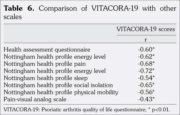 Conclusion: Turkish version of VITACORA-19 questionnaire is a reliable and valid measure for health-related quality of life in Turkish patients with psoriatic arthritis.