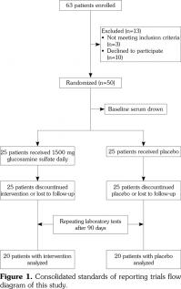 A total of 63 non-diabetic patients with OA (23 males, 40 females, mean age 64.8±8.66 years; range 53 to 81 years) were initially registered for this randomized, double blind, placebo controlled clinical trial which was performed between February 2013 and May 2014 in the Rheumatology Department of Mashhad University of Medical Sciences, Mashhad, Iran. All patients met the American College of Rheumatology criteria for the diagnosis of OA of the knee or the hip.(14,15) Patients, either diagnosed with diabetes, or with a family history of diabetes, body mass index <20 and >30 kg/m(2)), history of liver or renal disease, myocardial infarction, inflammatory diseases, pregnancy or lactation, systemic diseases that induce insulin resistance and those taking drugs that interfere in glucose metabolism including anticonvulsants, glucocorticoids and antipsychotics, were excluded. Thirteen patients were excluded on the grounds that they either subsequently declined or failed to meet our inclusion criteria. The remaining 50 patients (18 males, 32 females, mean age 63.9±6.86 years; range 50 to 79 years) were divided into two equal groups in a blind manner by computerized randomization. Both observers and the patients were blind as to the type of randomization and the drug form. After drawing serum baselines, first group received the usual dose of 1500 mg (500 mg x 3 capsules daily) glucosamine sulfate (Heaith Burst Company, Ohio, USA) for 90 days, whereas the second group received placebo capsules containing cellulose. Both groups were allowed to use analgesic medications, which they had taken before as needed. Every month, based on a random number chart, patients received boxes of 90 capsules of glucosamine or placebo from the dispenser in our center for three months and we ensured that the capsules were used fully and properly. After 90 days, laboratory tests were repeated in all patients. We excluded five patients in each group as they failed to take the drug or did not refer for follow-up. Finally, the study was completed with 40 patients (15 males, 25 females, mean age 63.8±7.64 years; range 49 to 80 years) with non-diabetic OA and body mass index within the medium range.