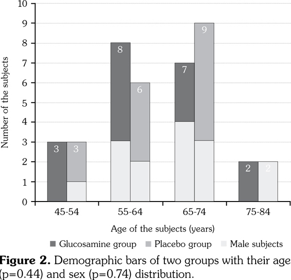 The two groups were similar in terms of mean age and sex distribution (Figure 2). The mean ages in the glucosamine and placebo groups were 63.4±7.74 years and 64.9±8.46 years, respectively, with no significant difference between the two (p=0.44). Females constituted 65% and 60% of the glucosamine and placebo groups, respectively (p=0.74).