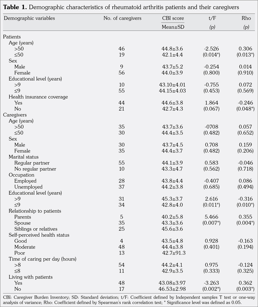 Results: A mean Caregiver Burden Inventory score of 44.0±4.0 was observed among caregivers of Chinese RA patients with self-care deficit. Among the five Caregiver Burden Inventory domains, developmental burden scored the highest (11.7±1.4), while physical burden scored the lowest (6.7±1.0). Among various demographic factors, patients’ age (r=0.306, p=0.013) and health insurance coverage (r=-0.246, p=0.04) were correlated with the level of caregiver burden. Besides, caregiver’s educational level (r=-0.316, p=0.01), relationship of caregiver with the patient (r=0.355, p=0.004), and whether or not the caregiver lived with the patient (r=0.362, p=0.003) were also significant factors. Predictive factors for caregiver burden of RA patients were identified as patient’s health insurance coverage and caregiver’s relationship with the patient, in agreement with the correlation analysis.