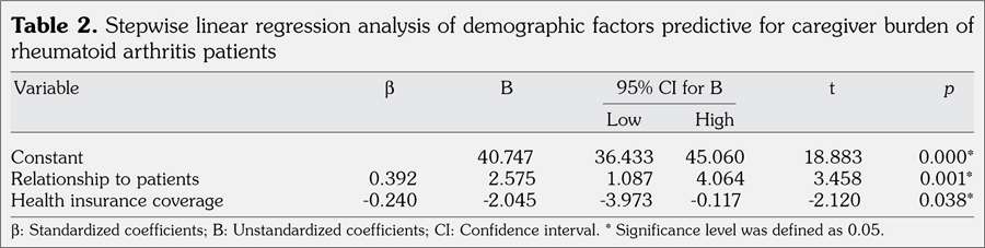 Demographic characteristics of RA patients with self-care deficit and their caregivers were also summarized in Table 1. Of the four demographic factors associated with the patients, age and health insurance coverage were correlated with the level of caregiver burden. Caregivers of patients of older age (>50 year-old) and those who had no health insurance experienced more stress than the other demographic groups. With respect to the demographic factors associated with caregivers, only three following factors were found to be relevant; educational level, caregiver’s relationship with the patient, and whether or not the caregiver lived with the patient. Caregivers with a high school education or higher (>9 years) were subject to more stress than those with a middle-school education or lower (≤9 years). Caregiver’s relationship to the patient also influenced his/her level of burden. Siblings or other relatives as caregivers had a higher level of burden than spouses (p=0.023) or parents (p=0.004). Besides, caregivers who did not live with the patients reported more stress than those who did. According to the stepwise regression analysis (Table 2), two most predictive factors for caregiver burden was patient’s health insurance coverage and caregiver’s relationship with the patient, respectively, in agreement with the correlation analysis.