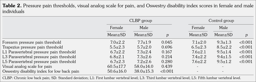 Patients and methods: A total of 121 patients (40 males, 81 females; mean age 36.8±9.9 years; range 18 to 50 years) having CLBP and 91 healthy controls (26 males, 65 females; mean age 34.1±10.2 years; range 18 to 55 years) were included. Pressure pain thresholds (PPTs) of all participants were examined with manual algometer in certain sites of their body.