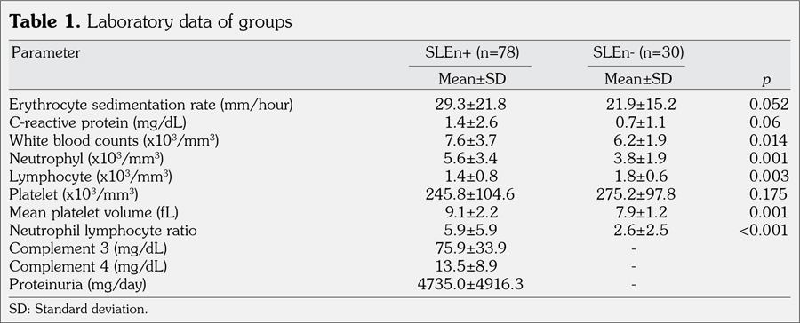 Patients and methods: A total of 108 SLE patients (8 males, 100 females; mean age 35.3±10.2 years; range 16 to 64 years) including 78 patients with renal involvement (8 males, 70 females; mean age 33.9±10.6 years; range 16 to 64 years) (SLEn+ group) and 30 patients without renal involvement (30 females; mean age 39.1±8.2 years; range 22 to 55 years) (SLEn- group) were included in this retrospective study. All patients’ clinical characteristics and laboratory data which include erythrocyte sedimentation rate, C-reactive protein, white blood counts, neutrophil counts, lymphocyte counts, platelet counts, and MPV levels were obtained from medical records. The laboratory data at the highest proteinuria periods of the patients with renal involvement were recorded.