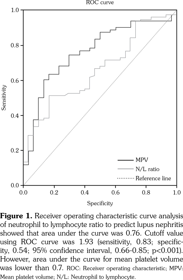 Conclusion: Neutrophil to lymphocyte ratio and MPV may be discriminative for lupus nephritis. Also, NLR may be a predictor of lupus nephritis. Both MPV and NLR values may be affected by a great number of factors; therefore, further prospective studies are needed to evaluate the use of these parameters in SLE.
