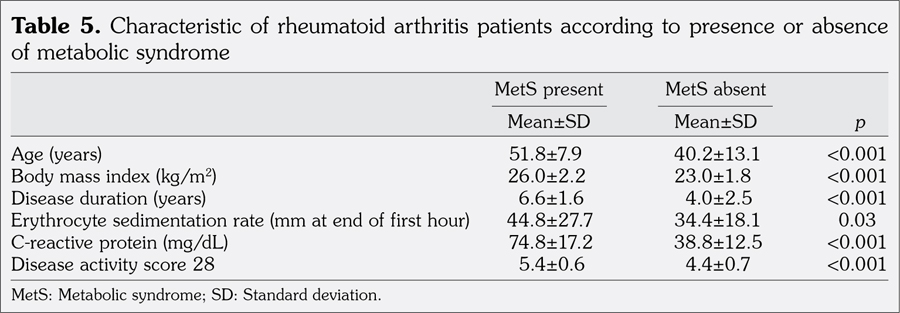 Results: Metabolic syndrome was found in 39.28% of RA group and 20% of control group according to National Cholesterol Education Program- Adult Treatment Panel III 2004 (p<0.005). MetS was most commonly detected in the 51 to 60 age group (65%). RA group was significantly more likely to have low high-density lipoprotein (63.09%), high triglyceride (53.57%), elevated blood pressure (41.66%) levels, and elevated waist circumference (38.09%). In RA group, disease activity score 28 (odds ratio: 6.51, confidence interval: 1.19-35.46 p=0.03), C-reactive protein (odds ratio: 1.13, confidence interval: 1.05-1.21 p<0.001), and duration of disease (odds ratio: 1.82, confidence interval: 1.04-3.18 p=0.03) remained independent predictors for presence of MetS in RA.