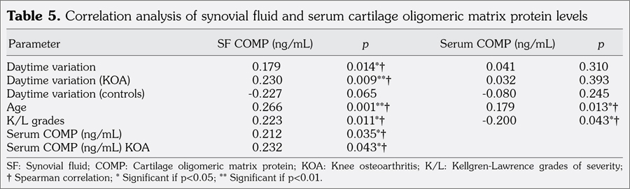 Objectives: This study aims (i) to compare synovial fluid and serum cartilage oligomeric matrix protein levels in patients with primary knee osteoarthritis and healthy controls, (ii) compare variations of synovial fluid and serum cartilage oligomeric matrix protein levels according to sex, Kellgren-Lawrence grades, and daytime sampling, and (iii) correlate the synovial fluid and serum cartilage oligomeric matrix protein levels with age, severity of disease, and daytime sampling.